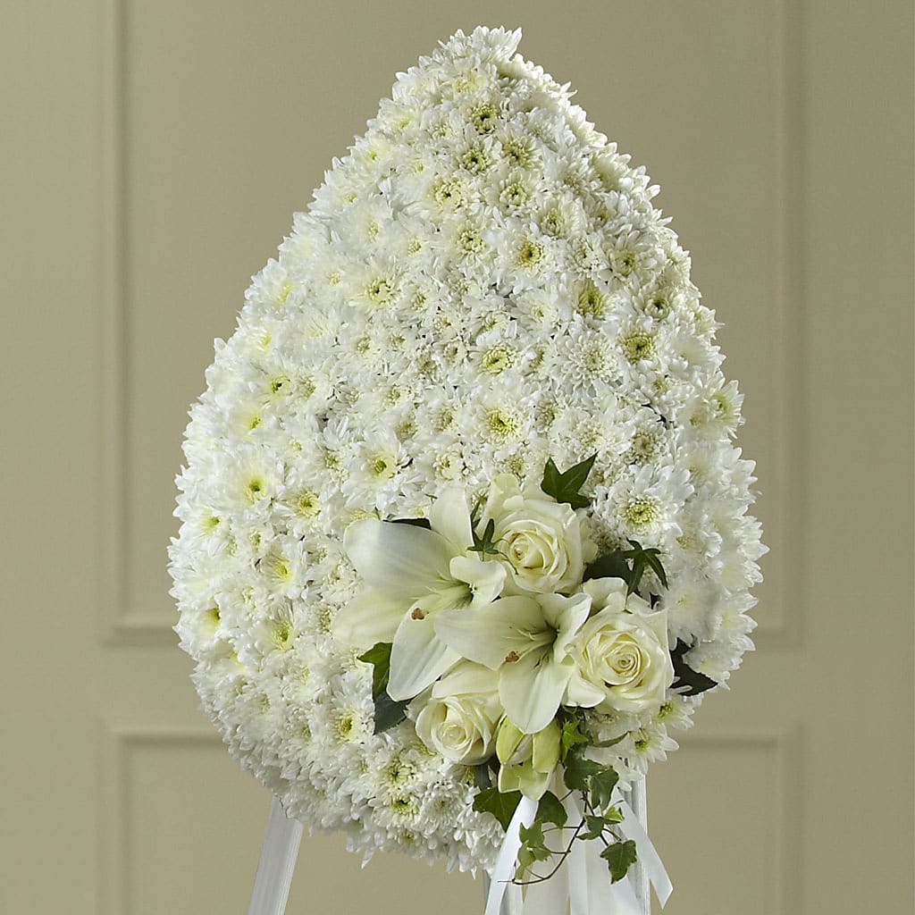 You can be sure that this exquisite expression of sympathy, crafted in the white of heavenly hope, will make a moving and impressive addition to a wake, funeral or burial service. Reflecting the form of a "teardrop," this generously scaled spray constructed by our artisan florists includes white pompons, roses and Asiatic lilies accented with a white satin ribbon bow.